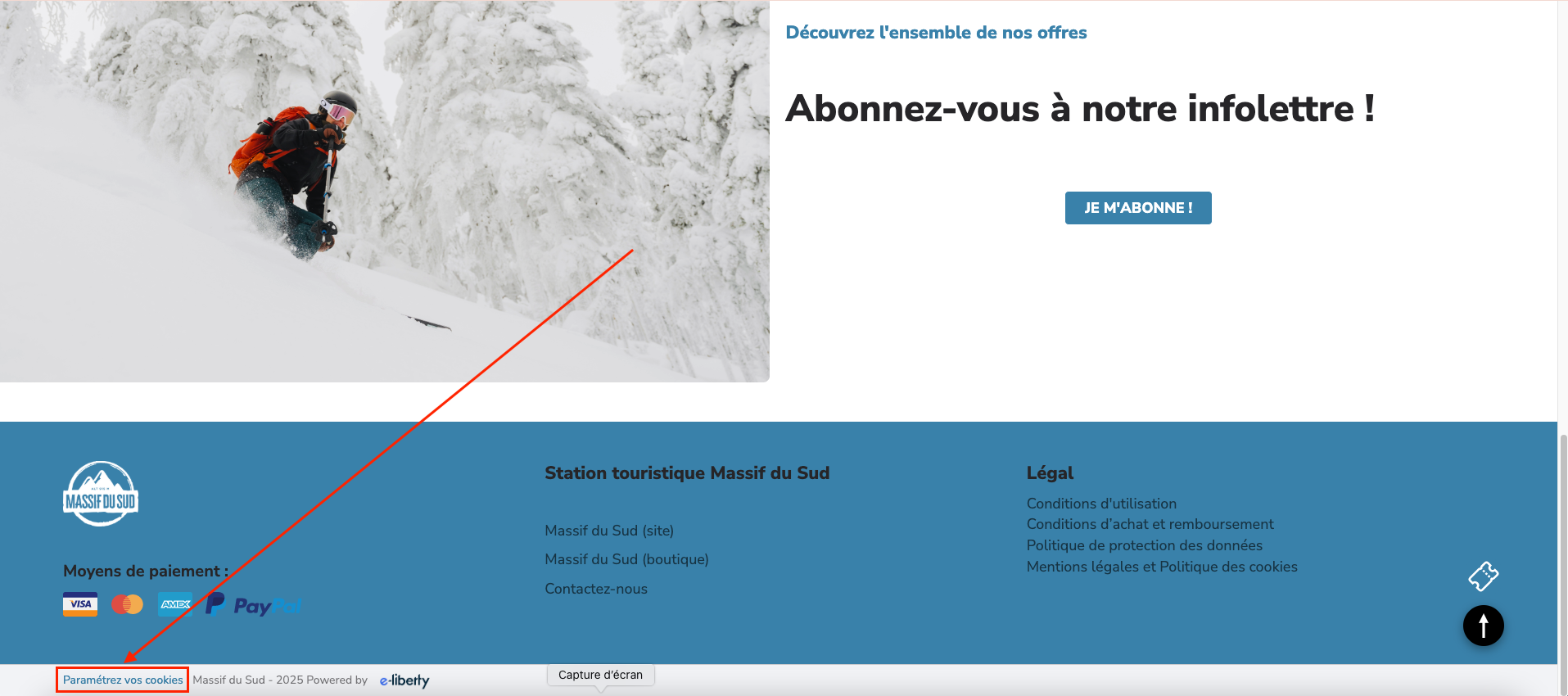 Lors de votre première visite sur notre site, un bandeau vous informe de l’utilisation de cookies. Vous pouvez accepter, refuser, ou personnaliser vos choix. À tout moment, vous pouvez modifier vos préférences en cliquant sur « Paramétrez vos cookies » en bas de page du site :